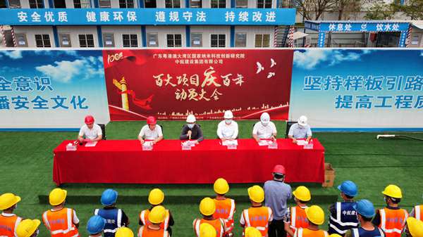 2021年3月29日上午,“百大项目庆百年”动员大会在集团公司承建的广州纳米生物安全中心总部园区一期项目现场隆重举行。建设单位广州纳米产业投资有限公司总经理李佩弦,广州珠江工程建设监理有限公司副总经理李晓光、分公司副总经理赵杰,广东省建筑设计研究院有限公司院副总工程师郭勇,上海德华会展策划服务有限公司南方工程有限公司总经理、项目总指挥徐刚,项目书记招国樑以及各专业分包单位相关人员参加活动。