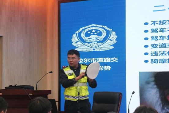 民警全面分析了我国的交通安全形式及引发交通事故的多重因素,并向员工演示了发生交通事故后应采取的措施及自救方法。